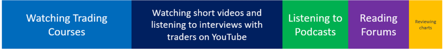 Since I started to study trading three years ago, I have been spending almost all the time allocated for trading, watching paid courses, watching short videos and listening to interviews with traders on YouTube, listening to Podcasts, reading a lot of books, and of course, reviewing some charts. If I think about how the time was distributed between these activities, it should look something like this: